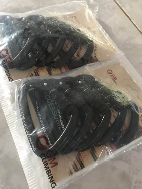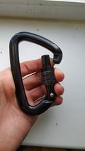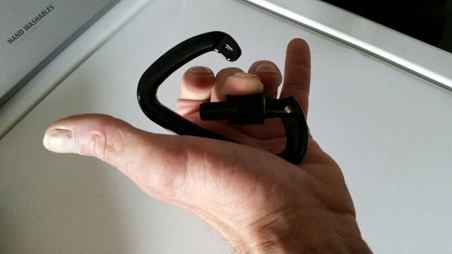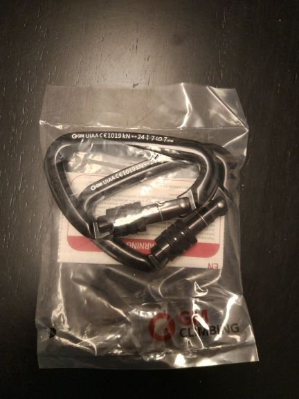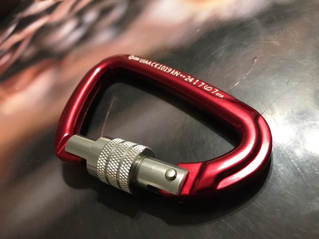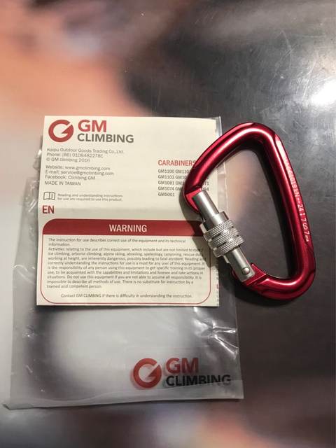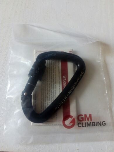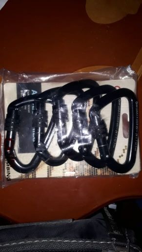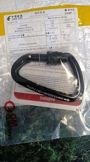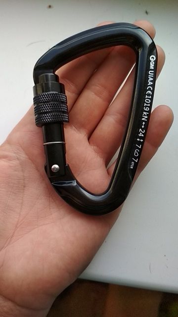 Great caribeener - shipped fast, exactly as pictured and described, very secure lock with nice strong spring action and a large opening - I have lifted several hundred pounds with this on the end of a chain and no problem - I would climb with this caribeener - picture shows size - I wear XL Mechanix gloves - great vendor - not my first ( or last ) purchase from this store - 6 stars