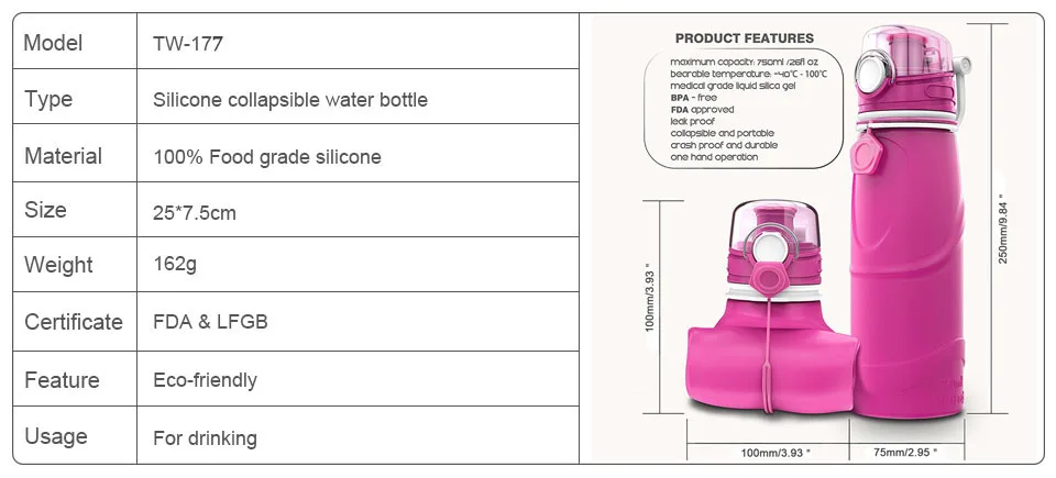 750ML Collapsible Silicone Water Bottle for the outdoors