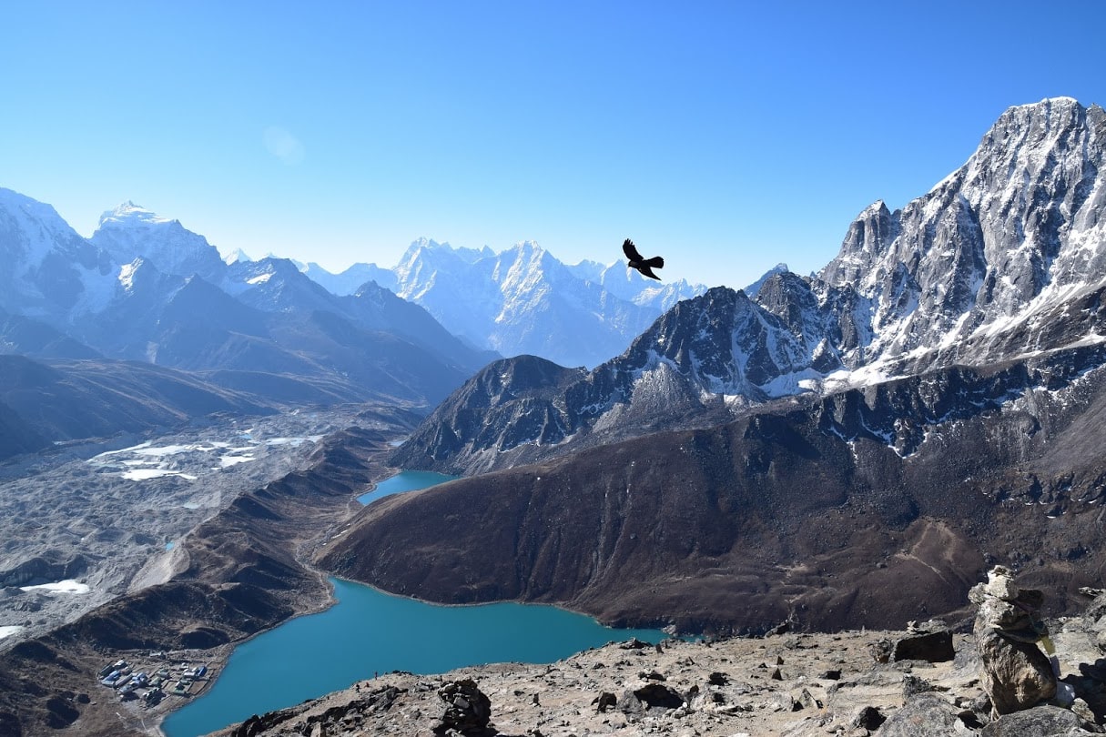 From Gokyo point, early in the morning, you climb over Gokyo Ri, a 5500 meters peak from which you can see the Everest, Cho Oyo, and other 8000 meters peaks. The panoramic view from Gokyo-Ri is so beautiful and peaceful.