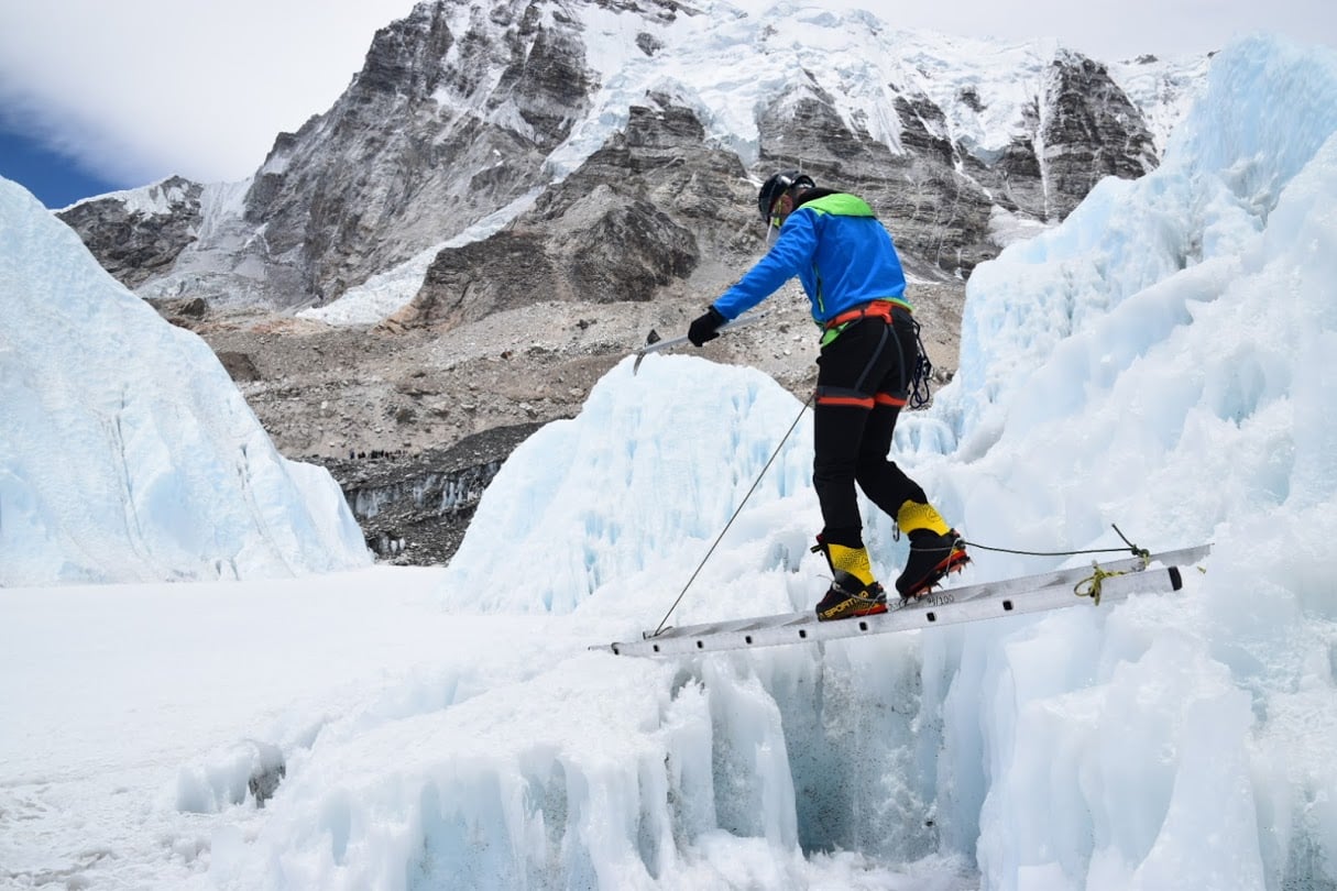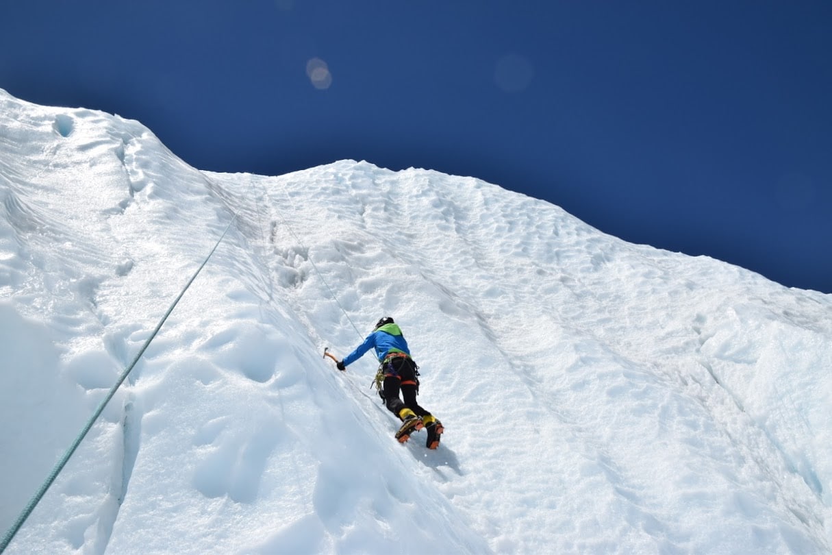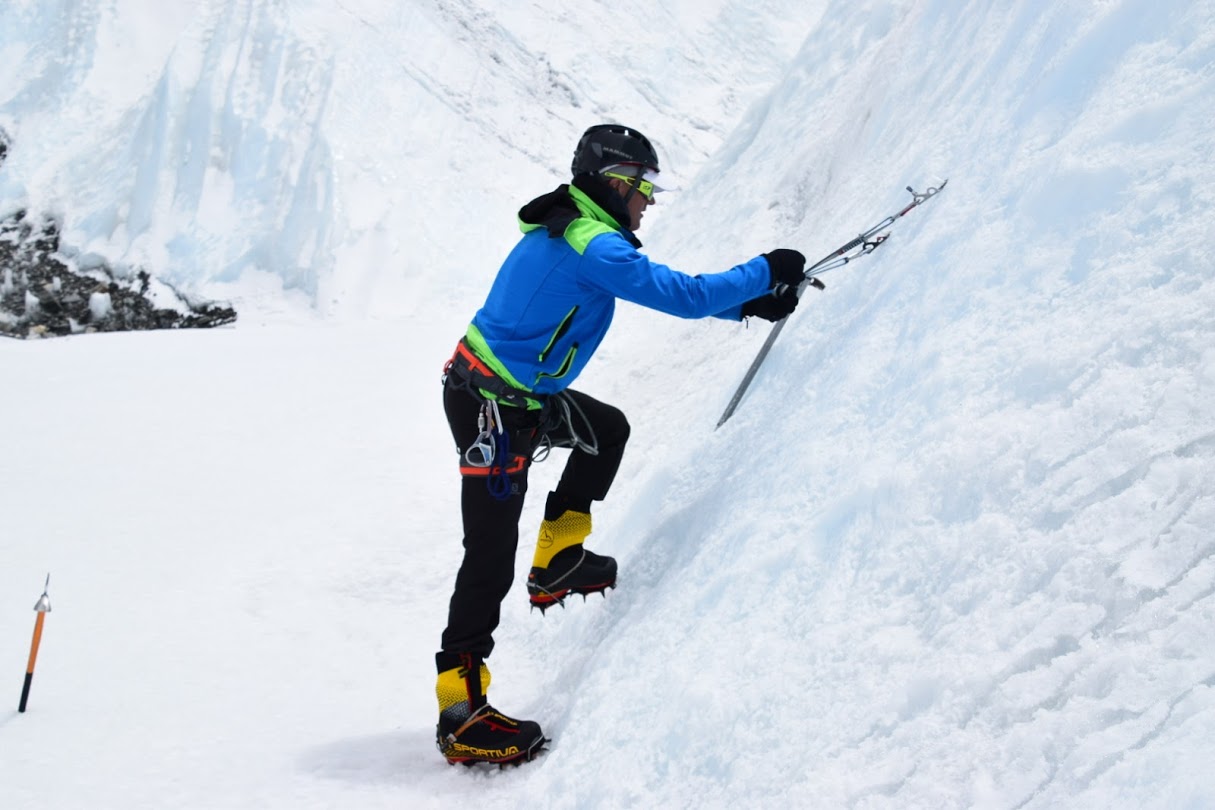 Here the training is focused on ice expertise. How to walk right on the ice, how to use right the ice ax, how to put ice-screws, how to secure and belay. Also, doing some ladder crossing training. This is required when you need in actual to ice crevasses, like those over the Khumbu icefall over the Everest and also when summiting Island Peak mountain, which we target to complete as part of this mountaineering experience.