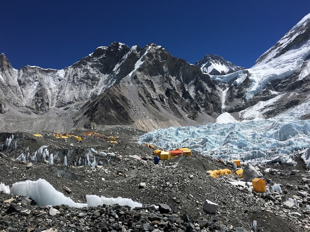 Its, morning time, and after a couple of hours walk from the guest house we finally reach our primary destination, Everest Base Camp!. The feeling is so amazing, being just under this majestic mountain. the rocky ice fall is full of tents of the base camp. from here the expeditions leave for climbing the Everest and its neighbor, Lhotse, the third highest mountain in the world.