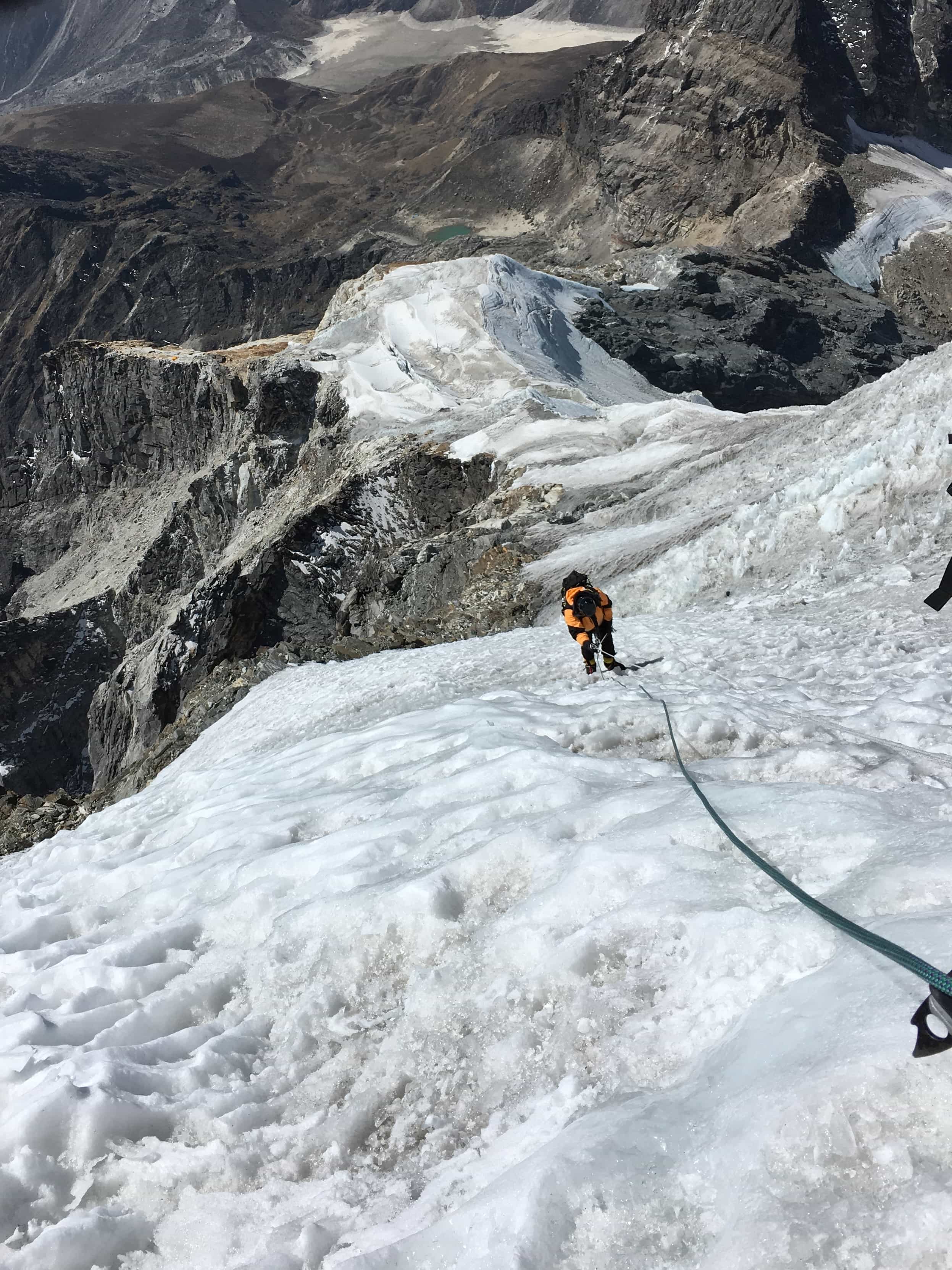 Lobuche Peak is 6119 meters high. In order to ascend and descend you will need to work with ascender tool, ice ax, ice-screws, snow rappelling and belaying while using different rope knots.
